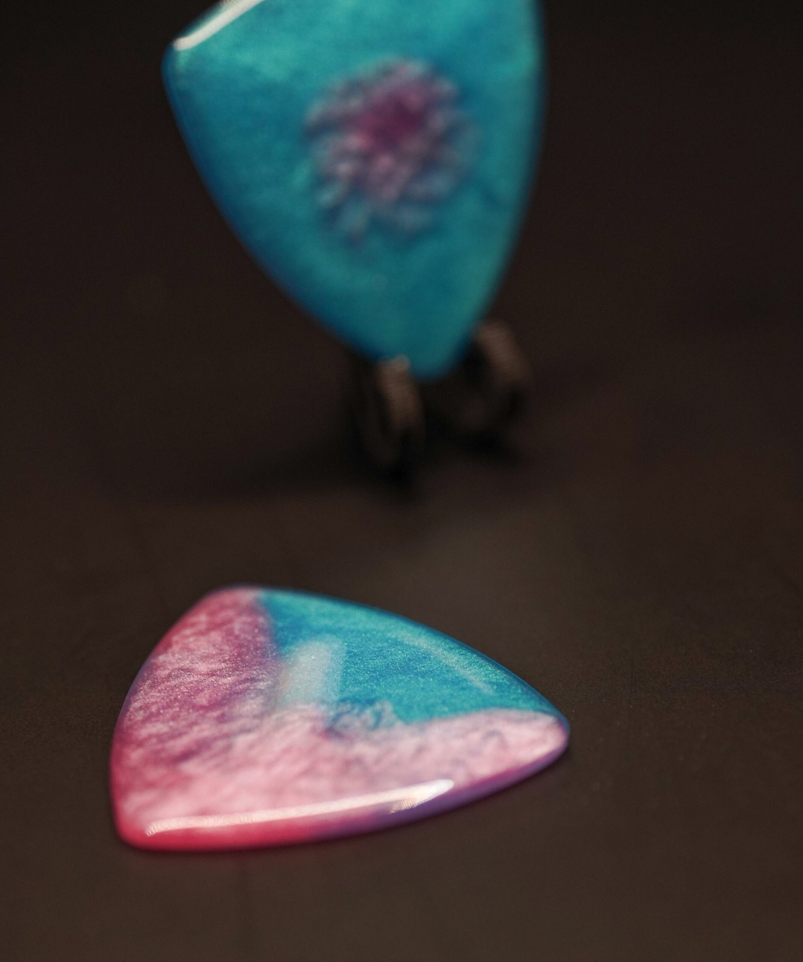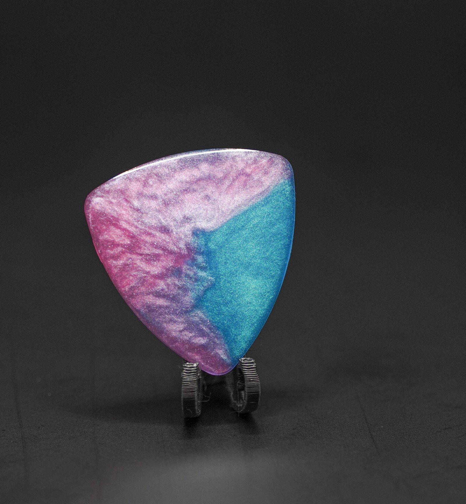 Candy Nebula guitar picks blend bright candy-pink and electric blue into a cosmic, swirling finish inspired by nebula clouds and neon light. Each pick is hand-poured from premium resin, creating organic color movement that makes every piece visually unique while keeping a consistent, vibrant look.