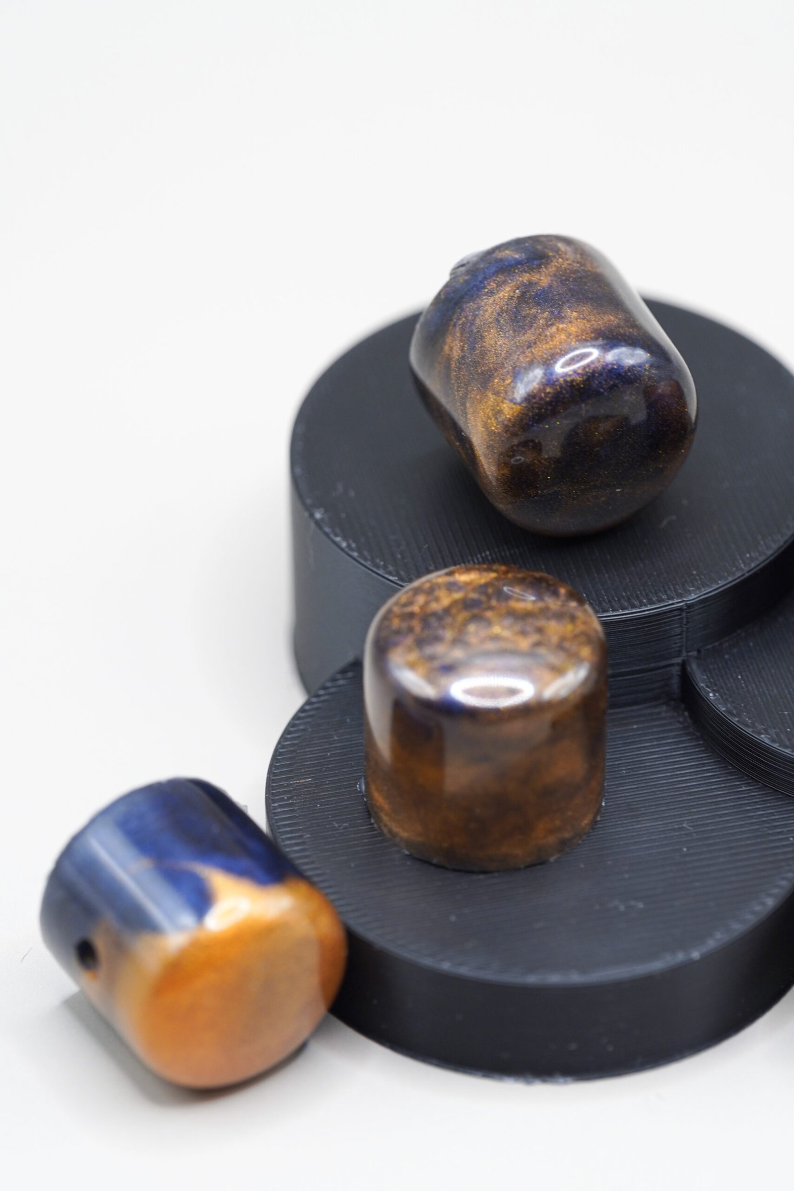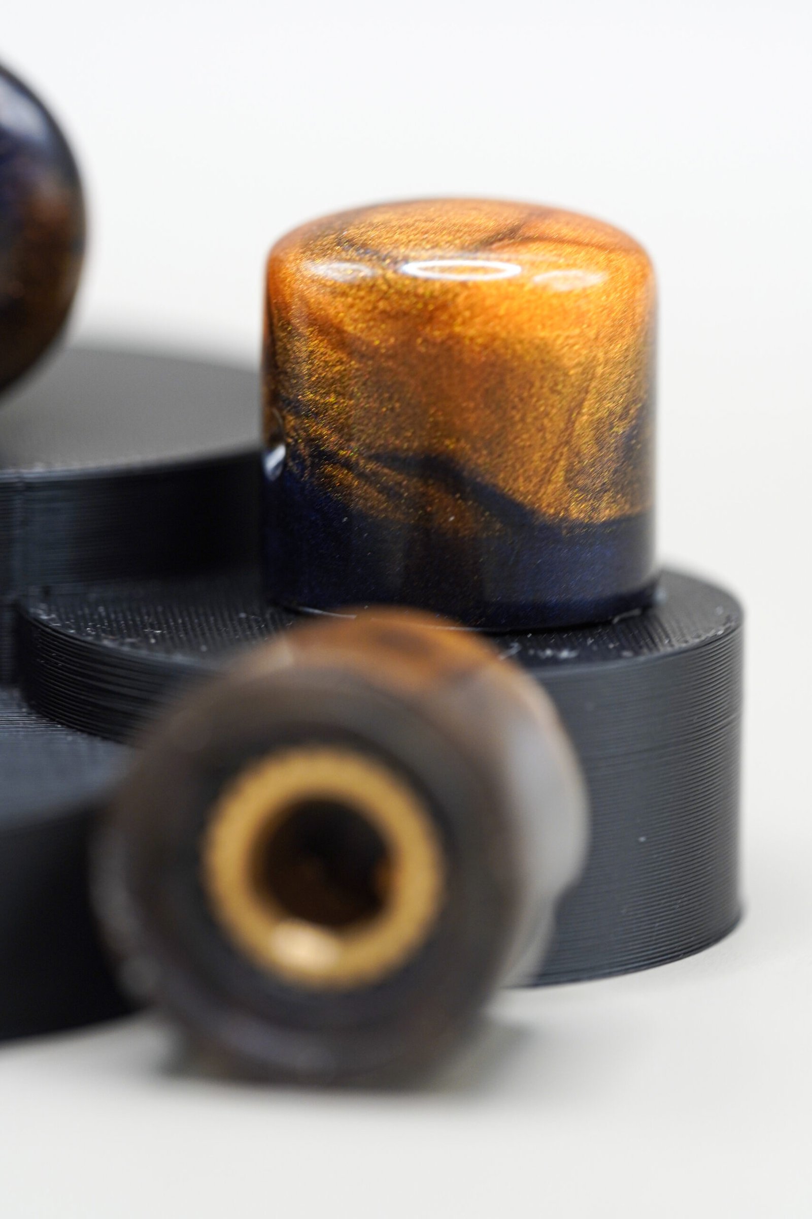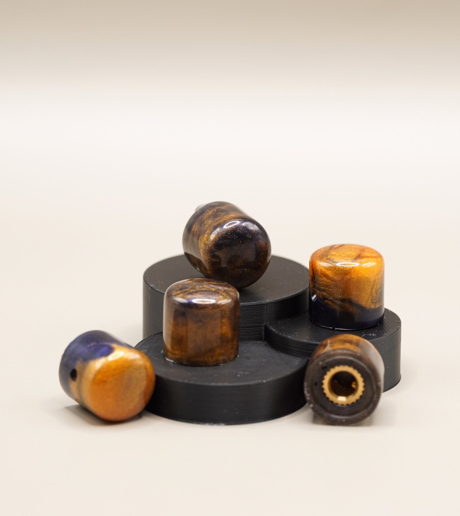 Elevate your guitar with this handcrafted resin knob set featuring a rich blend of deep blue and metallic gold. Each knob is hand-poured and unique, showcasing fluid swirls of color with subtle shimmer. Designed to fit standard 1/4-inch solid shaft pots, this set includes your choice of single, double triple or quad sets of knobs