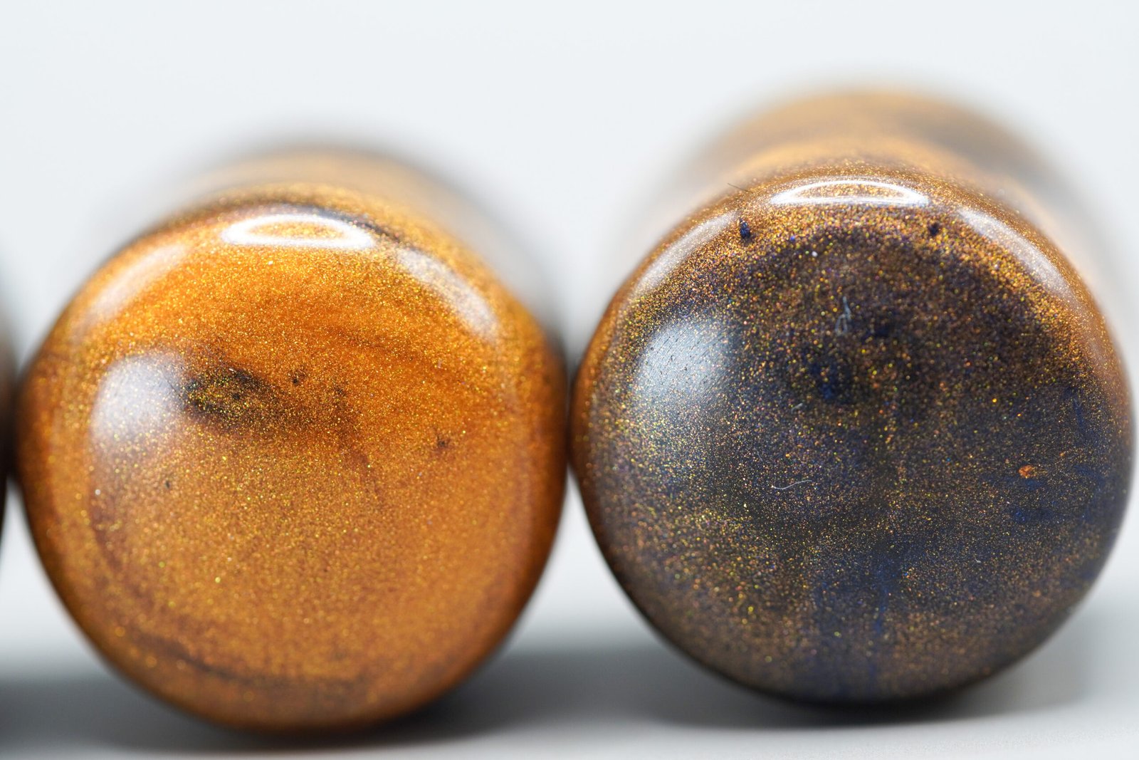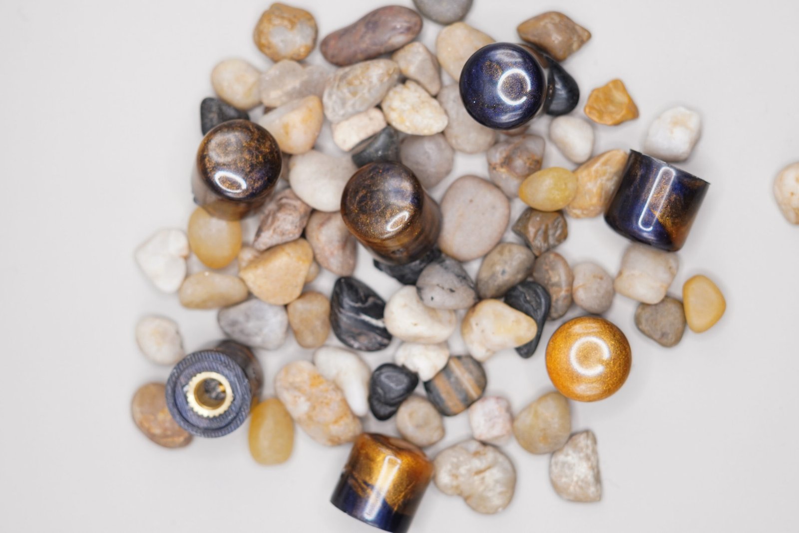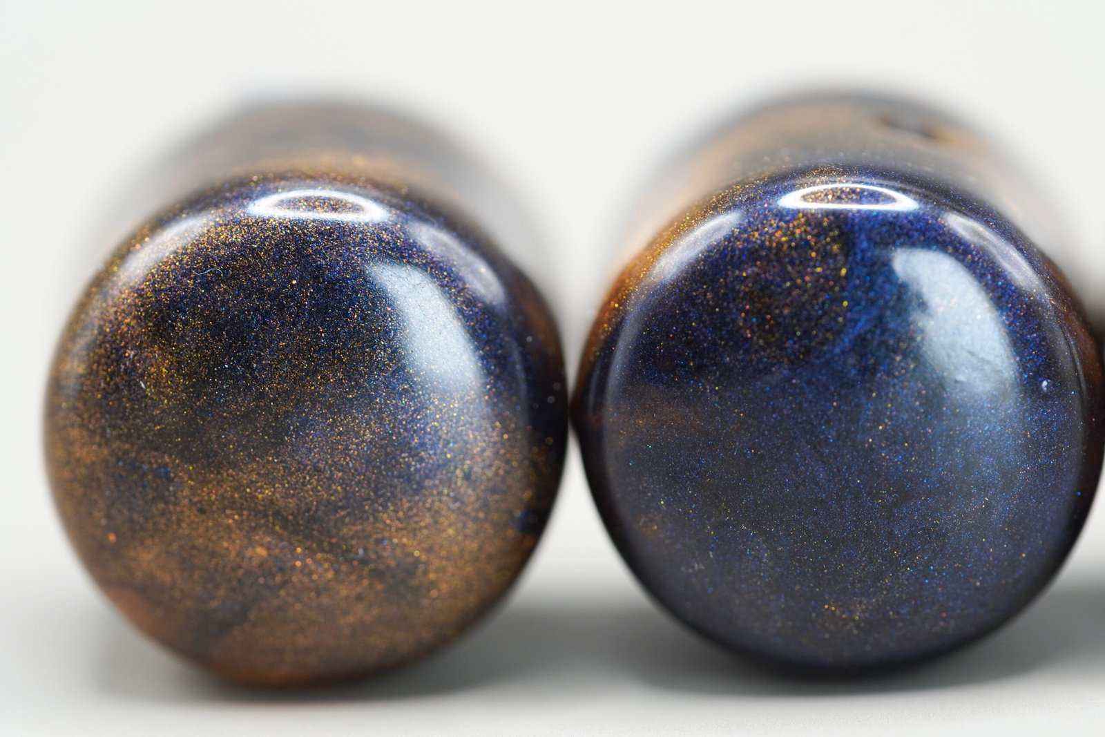 Elevate your guitar with this handcrafted resin knob set featuring a rich blend of deep blue and metallic gold. Each knob is hand-poured and unique, showcasing fluid swirls of color with subtle shimmer. Designed to fit standard 1/4-inch solid shaft pots, this set includes your choice of single, double triple or quad sets of knobs