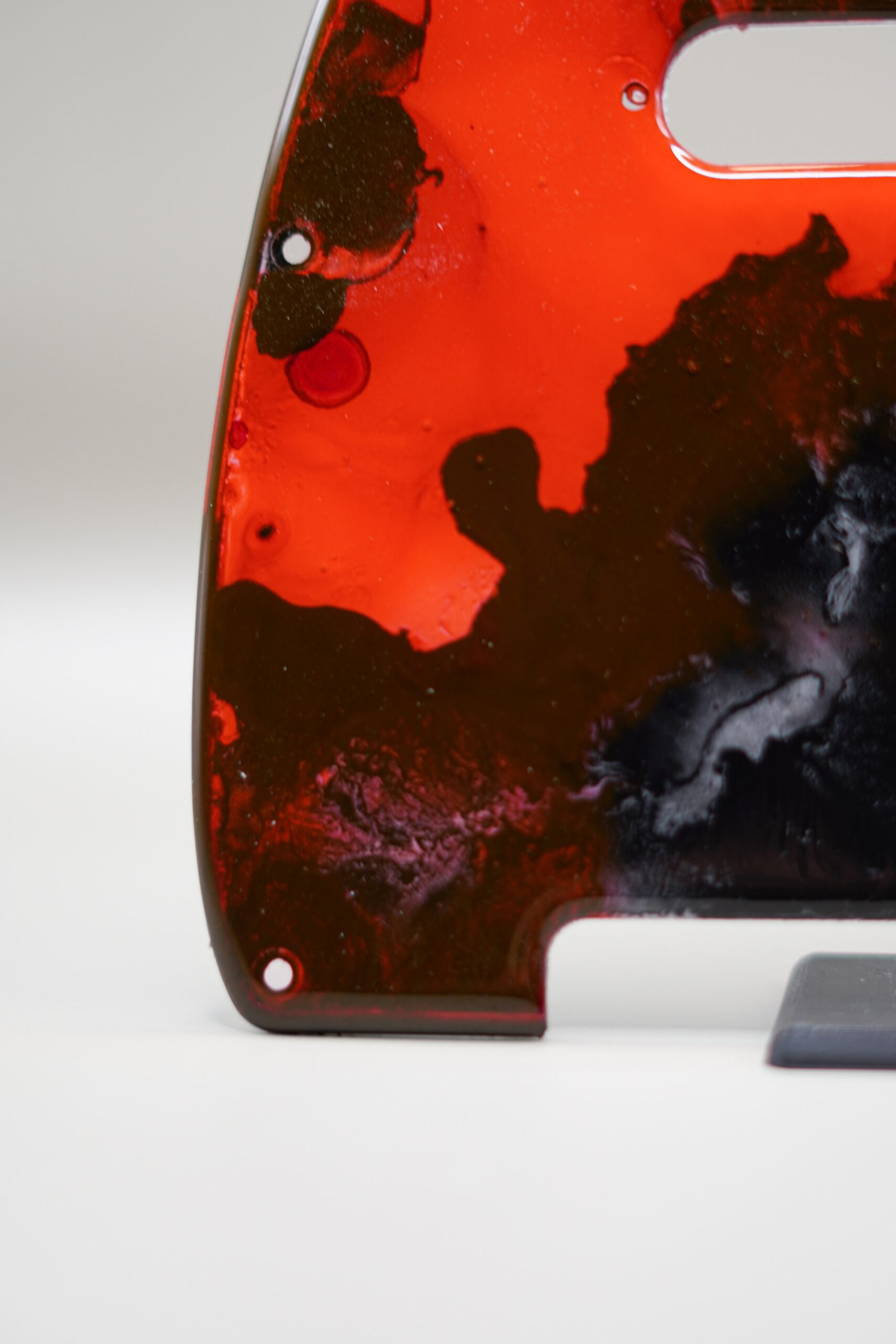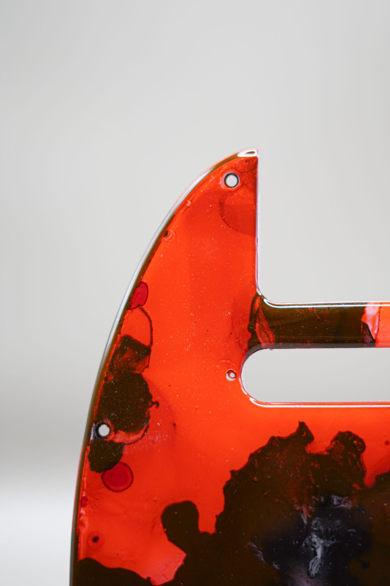 Introducing Fire Scarab, a one-of-one handcrafted Telecaster pickguard inspired by the fiery colors and organic patterns of beetle carapaces. Deep molten red, smoky black, and subtle flowing textures create a living, ember-like aesthetic that instantly transforms your Tele into a piece of functional art.