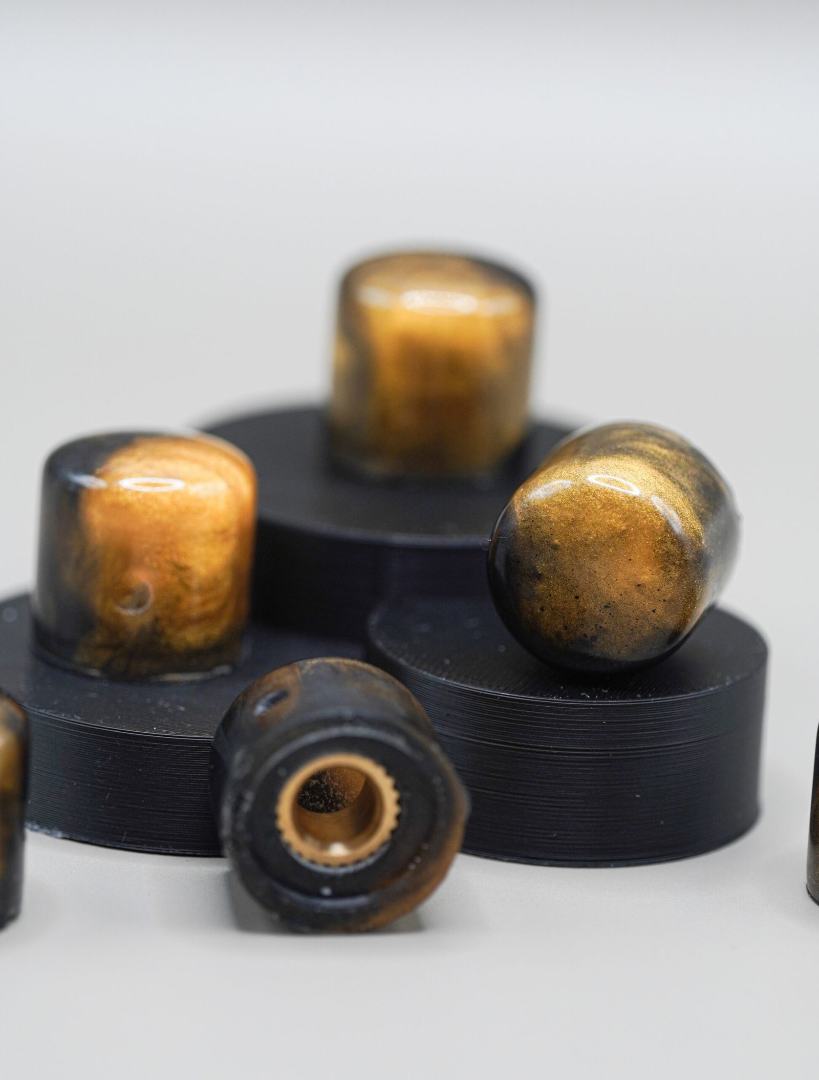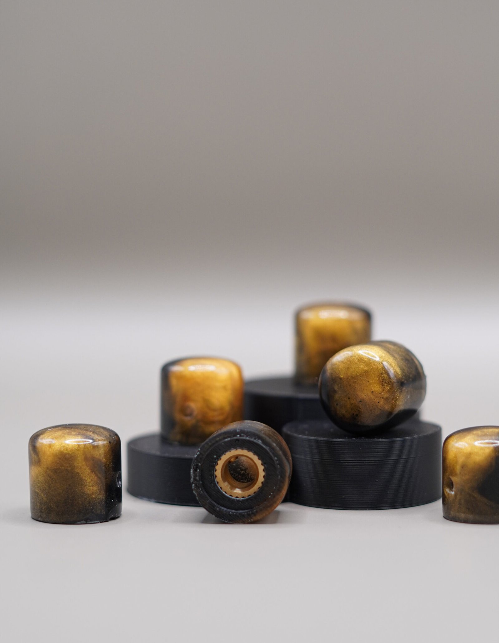 Introducing Mayan Obsidian, a one-of-one handcrafted set of resin guitar knobs blending deep carbon black with rich, metallic Mayan gold. Inspired by volcanic obsidian and ancient goldwork, this set adds a bold, luxurious, and historical character to any guitar.