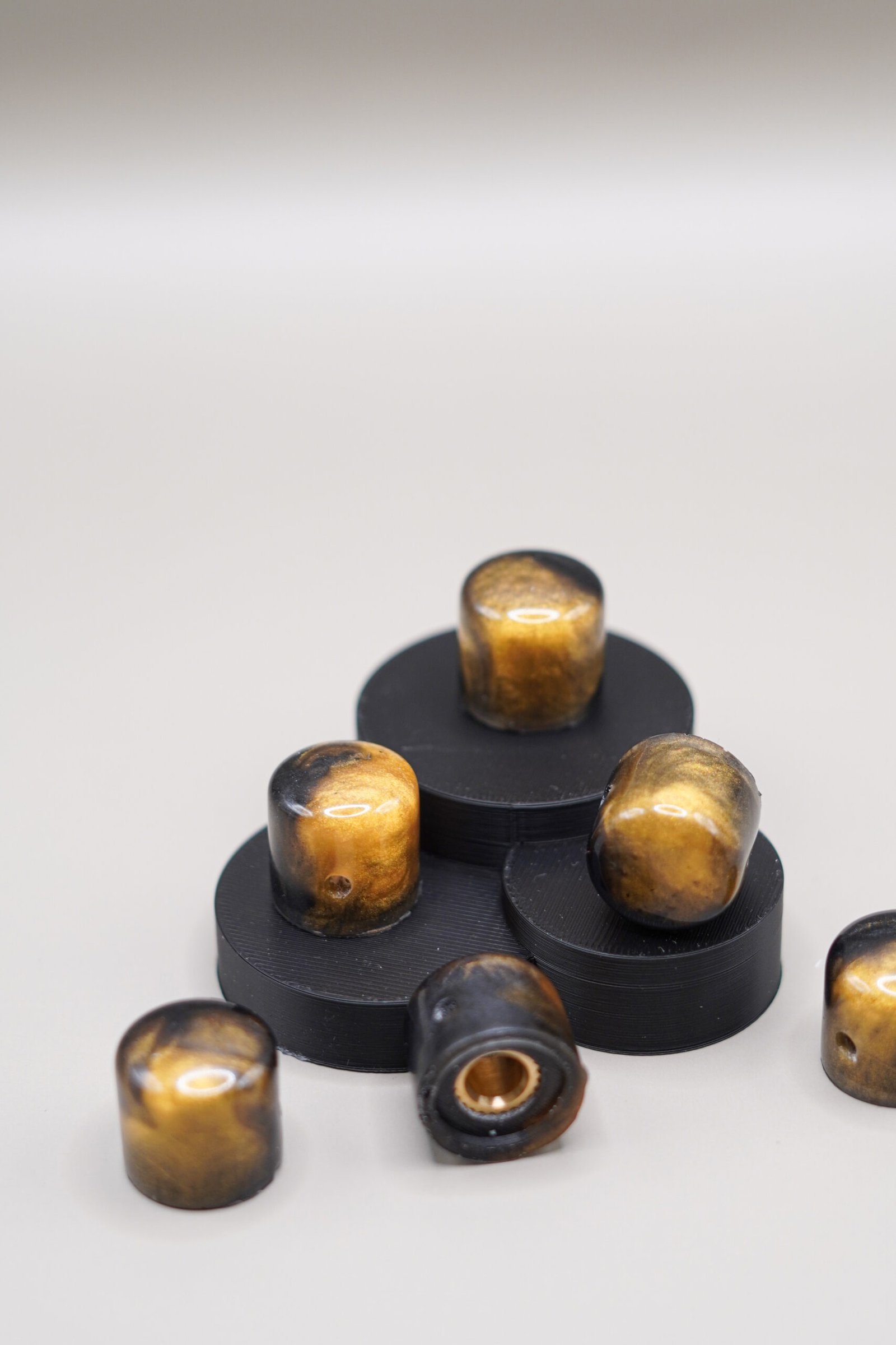 Each knob is individually poured, sanded, polished, and fitted by hand in the Epoxica workshop. No two will ever be identical — the resin swirl patterns form naturally, giving your instrument a true artisan-crafted aesthetic.