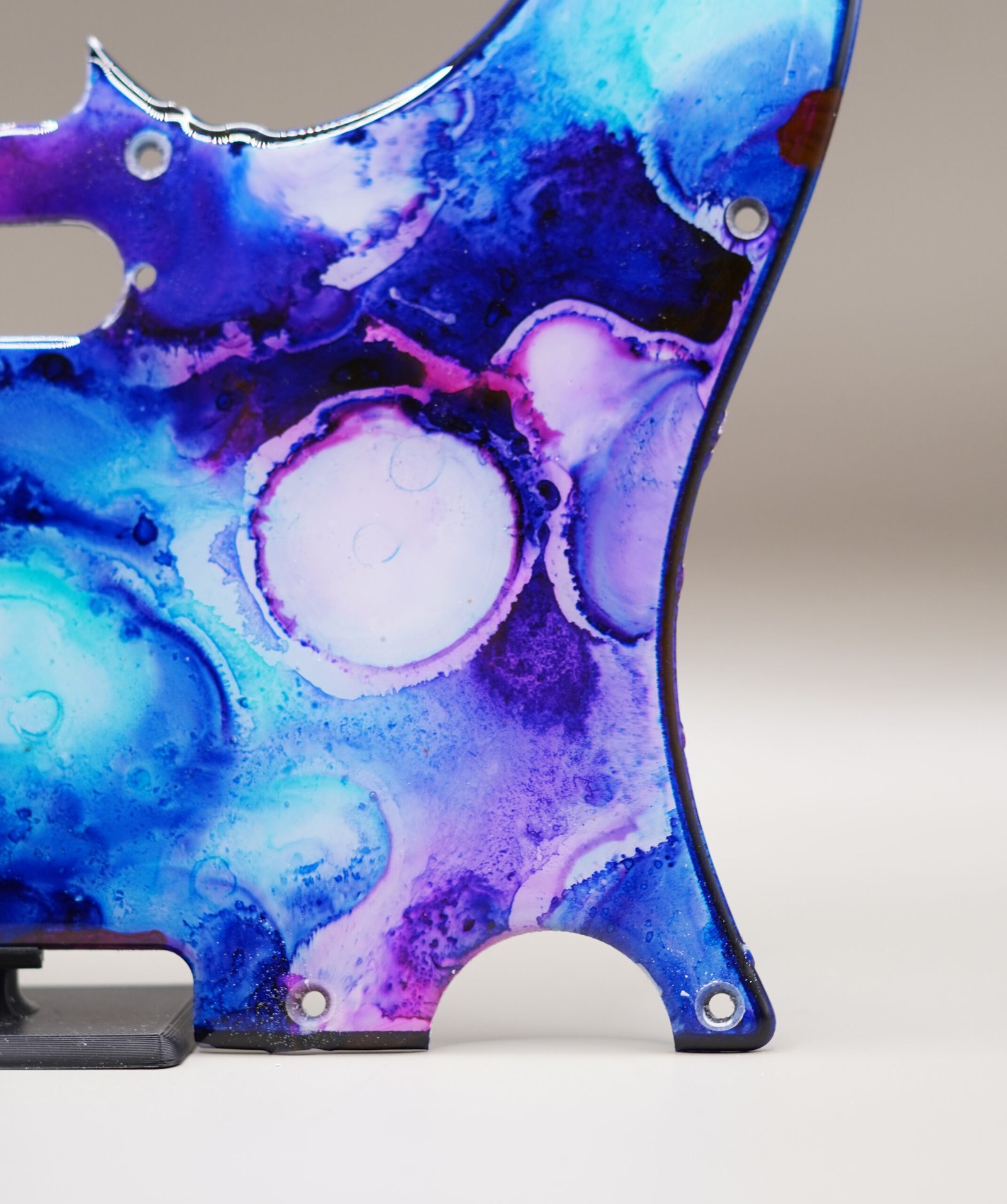 A premium pickguard featuring a flowing blend of deep blues, violets, and soft whites inspired by cosmic nebula clouds. space-inspired aesthetic that’s both modern and elegant.